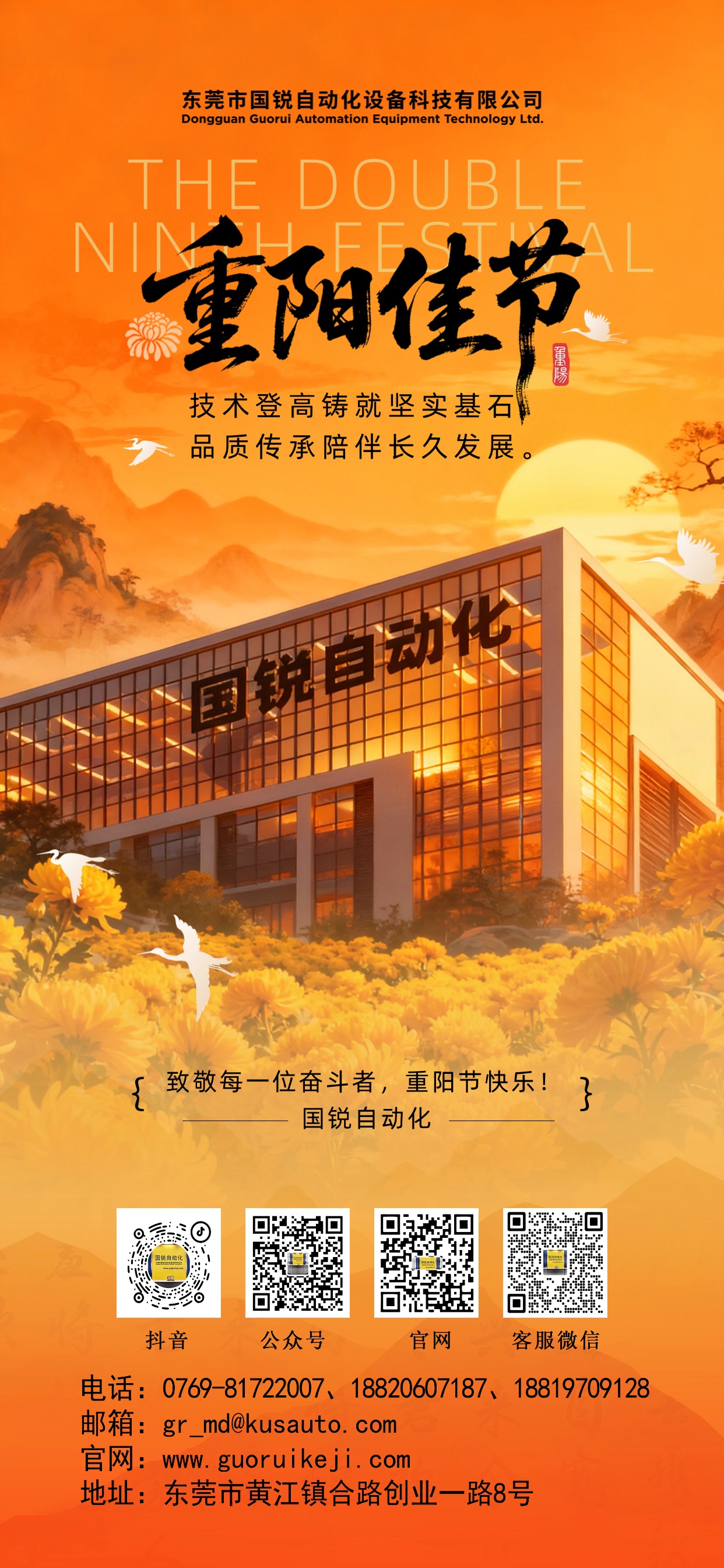 国锐在此重阳佳节,为您送上诚挚祝福。我们始终秉持匠心精神,以坚实可靠的品质与持续迭代的创新技术,长久陪伴并服务每一位客户。