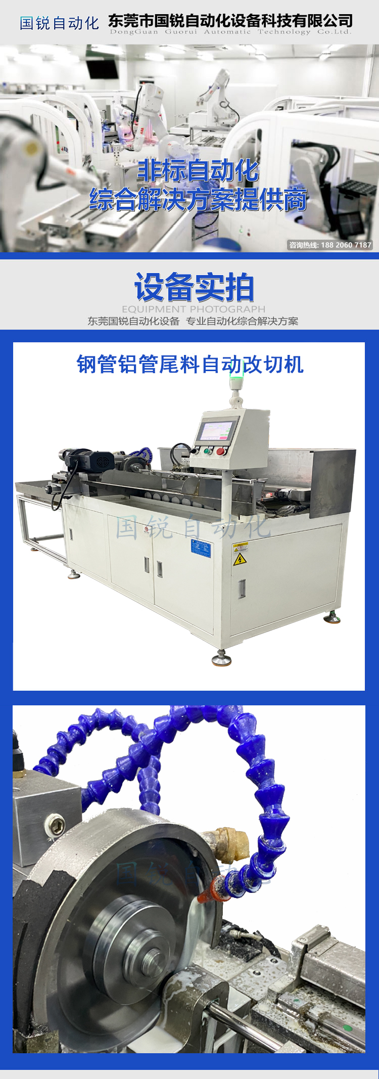 管材尾料自动改切机由送料模组、取料夹爪组件、物料压紧组件、短料收集盒、拉料组件、电机、切割头组件、冷却液系统组件和成品收集组件组成。